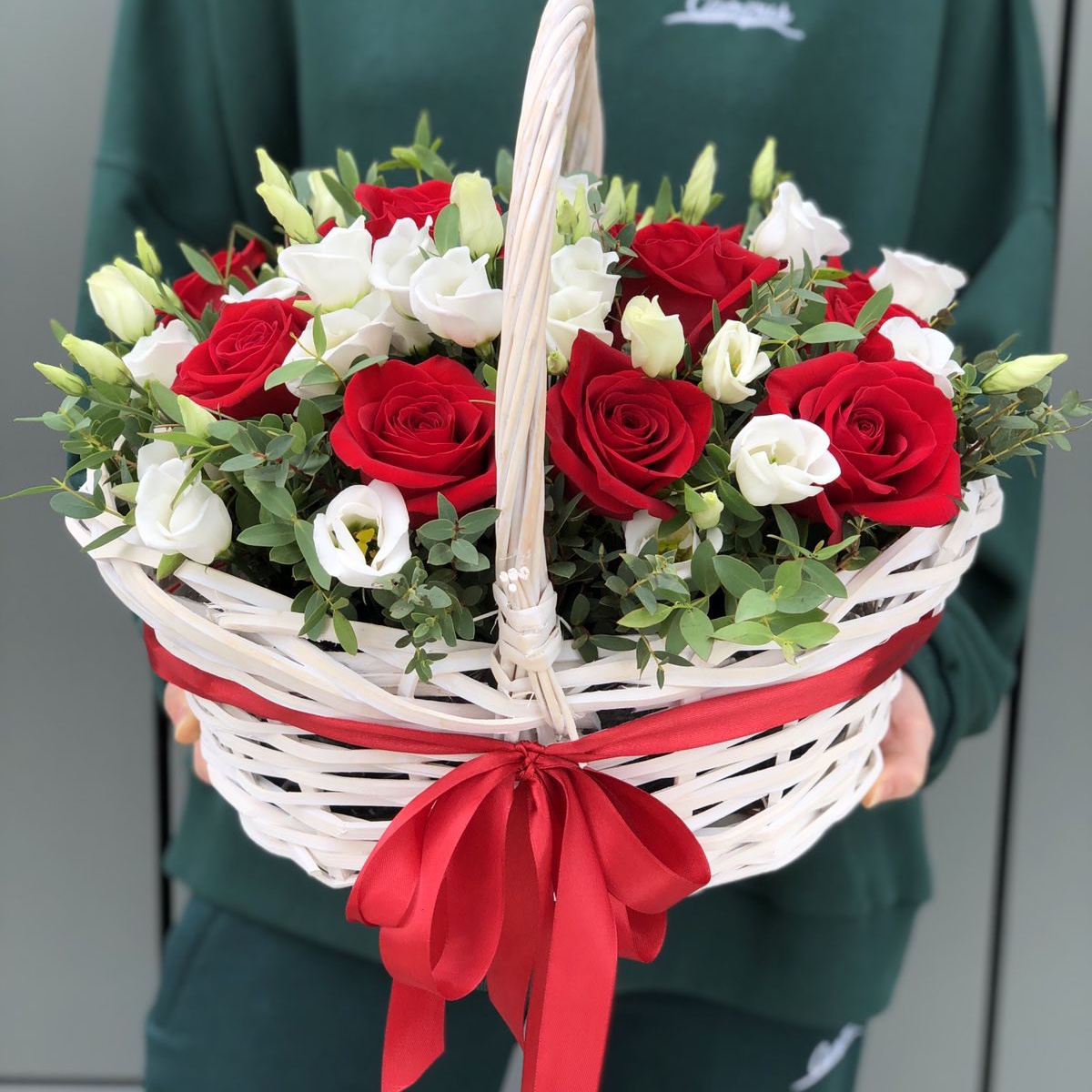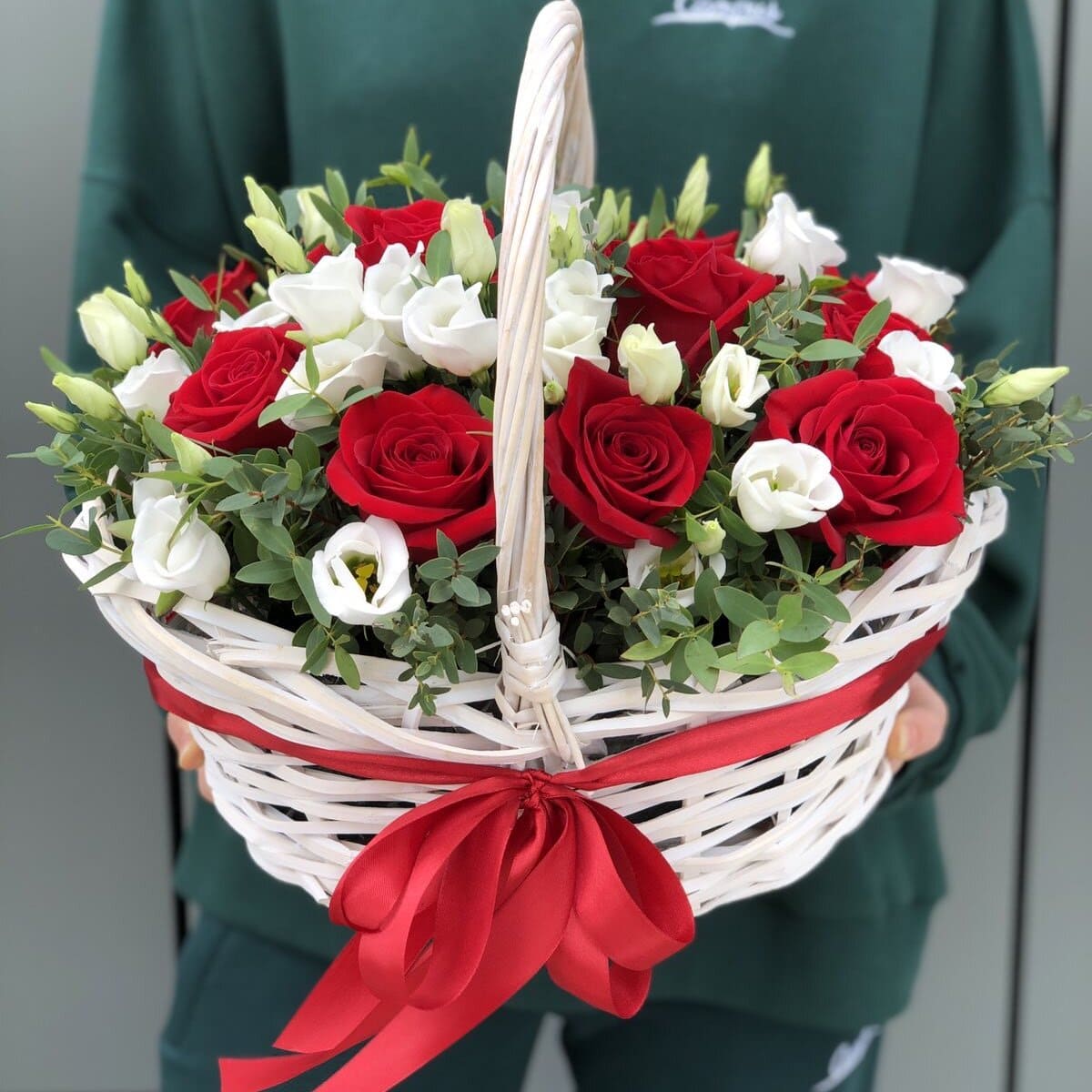 Композиция из алых роз и белой эустомы оформленная в плетеную корзину это сюрприз, способный выразить адресату все Ваши чувства, которые таяться у Вас в сердце! Этот букет, главной особенностью которого является цветовой контраст, станет необычайным подарком по поводу и без!