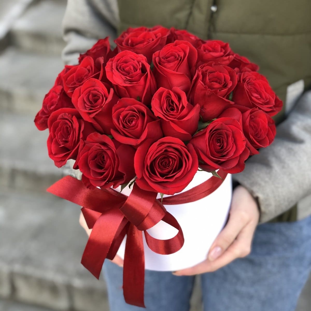 Состав: Роза красная (25), Коробка (1), Оазис (1)