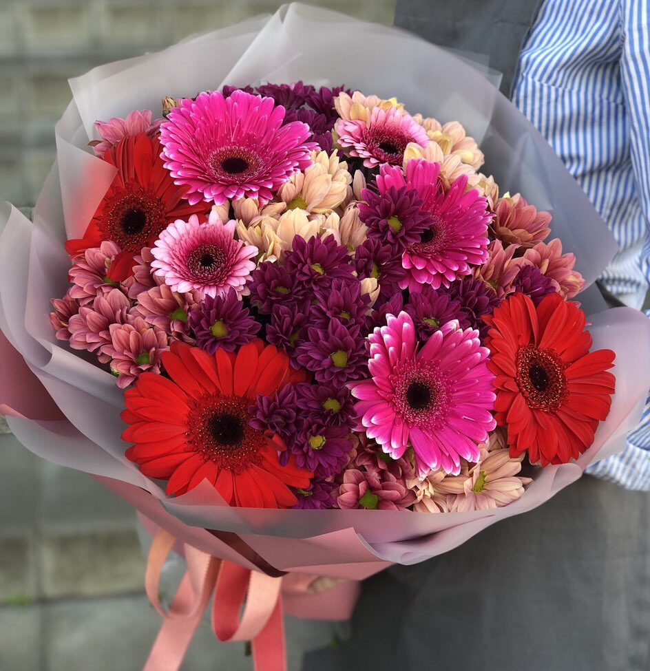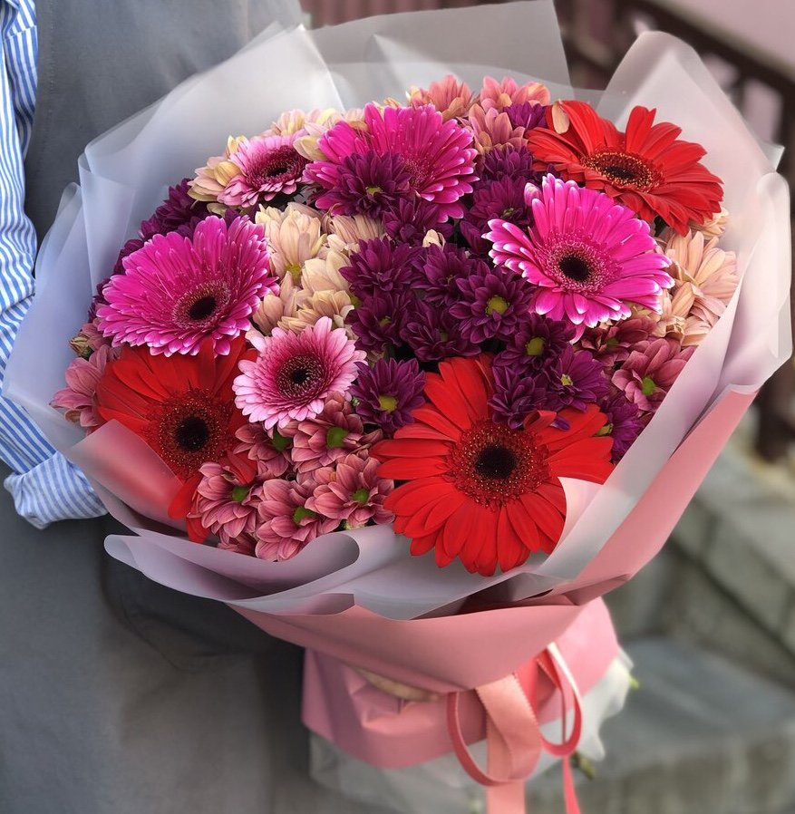 Яркий оригинальный букет из сочной герберы и свежей хризантемы. Флористическая композиция насыщена эмоциями которые долгое время будут радовать и останутся в памяти того, кто будет счастливым получателем букета.